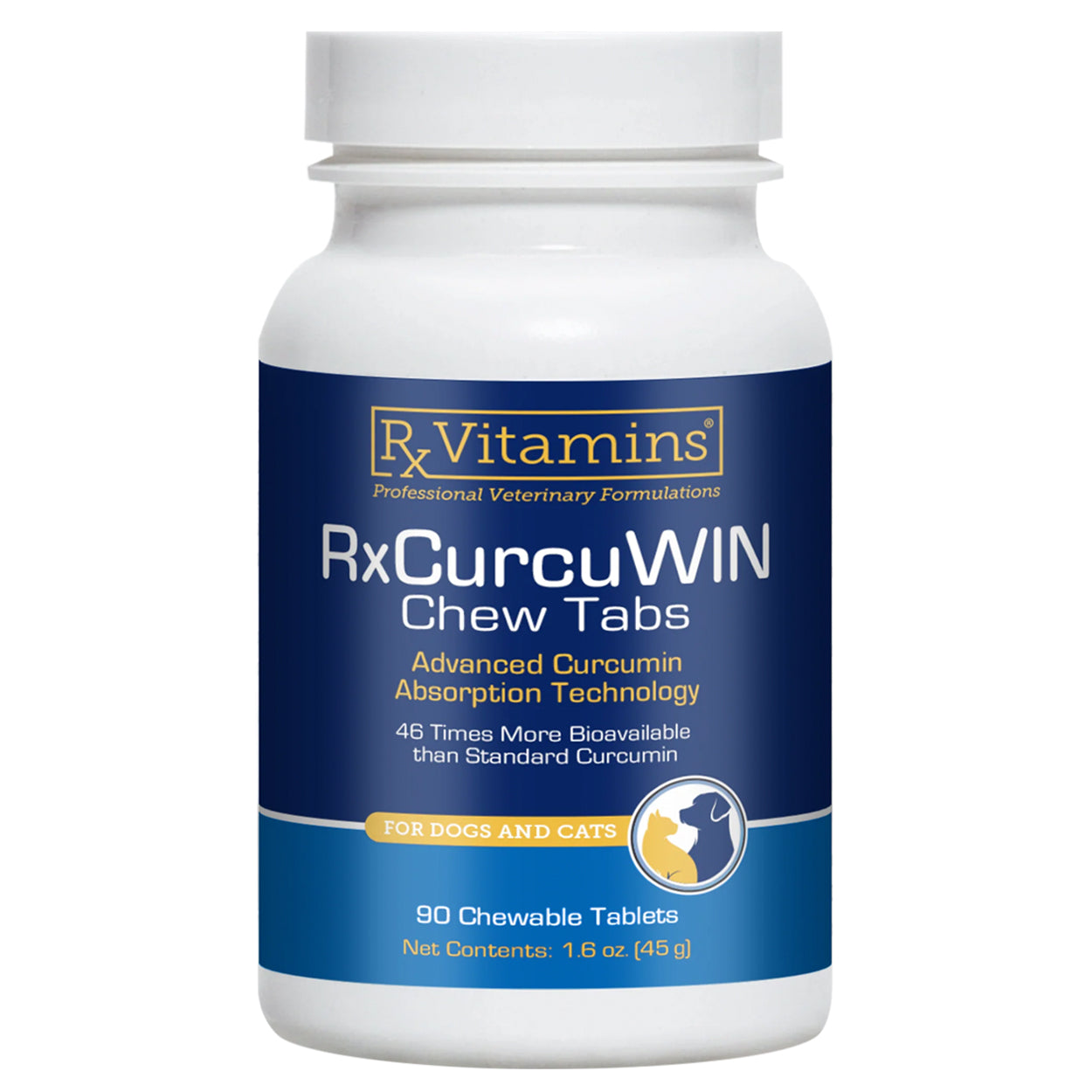RxCurcuWIN features a patented water-soluble curcuminoid complex for increased absorption. Research has found that curcuminoids benefit the immune system and help support a healthy inflammation response. Each chewable chicken liver flavored tablet contains 40mg of curcuminoids, suitable for both dogs and cats.